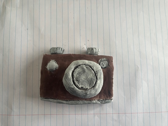 Op foto 1 ben ik net klaar met het kleien van mijn camera. Foto 2 is ongveer 4 dagen laten, mijn camera is hier helemaal opgedroogd. Je ziet dat hij een stuk donkerder is geworden. Op de 3e foto had ik mijn kwasten en mijn verf klaargelegd om te beginnen. Op de 4e foto heb ik grotendeels van de camera bruin geverfd en daarna heb ik de lens en de knopjes iets donkerder gemaakt zodat de overgang niet te groot is. Foto 5 is het uiteindelijke eindresultaat.